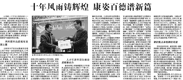 報道從公司的科研成果、改革創(chuàng)新精神、人才引進和團隊建設、主題活動、未來憧憬等方面,反映了公司成立10年來所取得的一系列驕人業(yè)績和公司發(fā)展過程中形成并堅持的品質(zhì)精神、價值理念、管理運營模式。這是該報為公司10周年華誕送上的一份大禮,必將激勵全體康姿百德人在新的起點上振奮精神、開拓進取,取得新的更大的業(yè)績。
