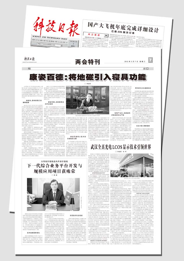2012年3月7日,《科技日?qǐng)?bào)》兩會(huì)特刊對(duì)秦皇島康姿百德高新技術(shù)開(kāi)發(fā)有限公司進(jìn)行了大篇幅的專(zhuān)題報(bào)道。整篇報(bào)道立體地展現(xiàn)了康姿百德磁性功能寢具的獨(dú)特優(yōu)勢(shì),全面地回顧了康姿百德輝煌的發(fā)展歷程。