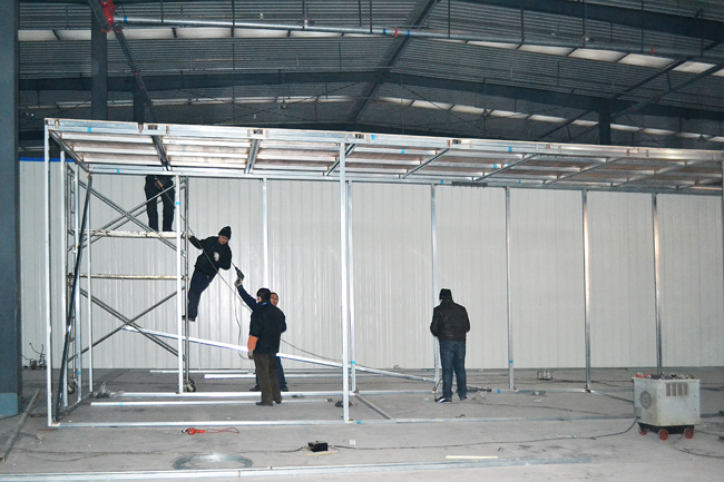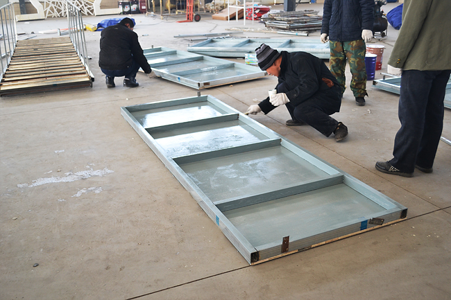 近日,中央電視臺《過年七天樂》節(jié)目錄制準備工作緊張有序的進行著。為減輕節(jié)目組的壓力,秦皇島康姿百德高新技術(shù)開發(fā)有限公司制造中心機修組主動承擔(dān)了舞臺背景的制作任務(wù)。 制造中心現(xiàn)場總指揮張振忠經(jīng)理介紹:“舞臺背景氣勢宏偉,運用了燈籠、瓷器、木雕、中國結(jié)、山水畫、鏤空屏風(fēng)、青磚墻等豐富的中國文化元素進行布局裝飾,工程量和工藝難度非產(chǎn)大。時間緊、任務(wù)重,要不打折扣的實現(xiàn)圖紙的設(shè)計風(fēng)格,我們的壓力山大啊”。 1500平方米的制造車間內(nèi),機器轟鳴、電焊火花四濺,一派繁忙景象。工人們手持電焊機、切割機、雕刻機、角磨機、電鉆、手提鋸、曲線鋸、自制刀剪等十八般武器,各顯神通。從28日晚上8點接到任務(wù)到31日晚8點,制造中心的50多名工人每天都要忙碌到凌晨3點。 工作人員經(jīng)過三天奮戰(zhàn),于31日晚8點完成舞臺背景制作任務(wù),并于當(dāng)晚運到《過年七天樂》錄制現(xiàn)場組裝。