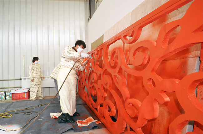 工作人員在涂刷漆門