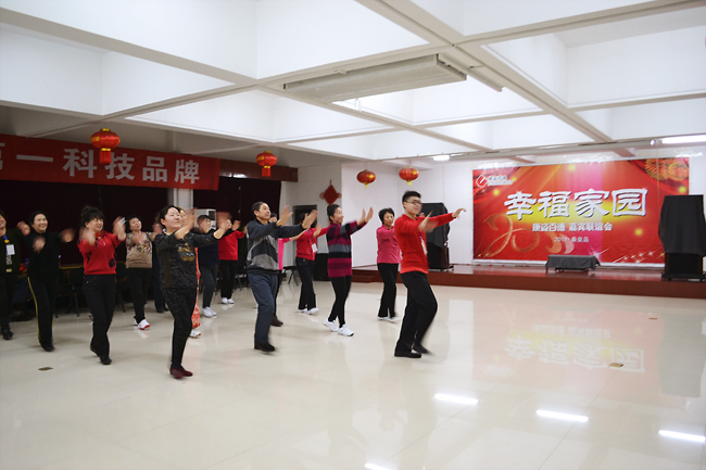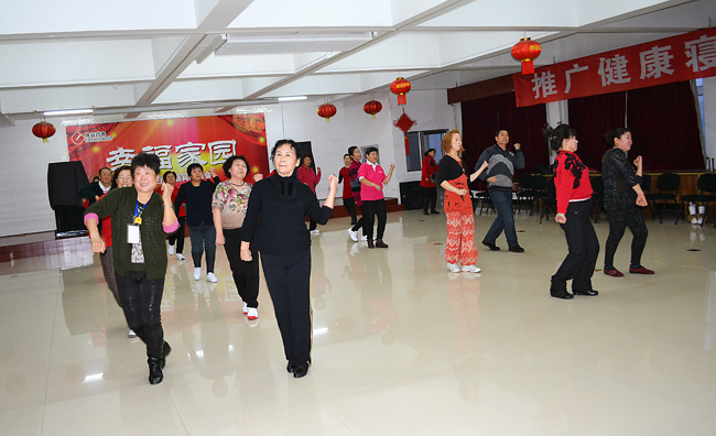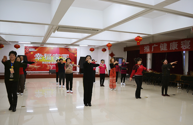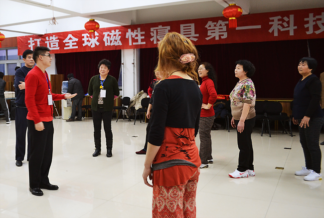 最早趕到康姿百德公司排練場地的是16位伴舞人員,都是50歲以上的中老年人。她們從早晨8點半開始便投入了一遍又遍地排練。每排練一遍,舞蹈老師都會進行細微的糾正、調(diào)整隊形和調(diào)動情緒。每位健身操隊員也沒有因為反復(fù)的走位表現(xiàn)出疲憊或煩躁,始終面帶笑容,激情勃勃的投入排練。因為投入的運動量非常大,很多人都是滿頭大汗,演員們就索性脫下厚實的棉衣輕裝上陣。