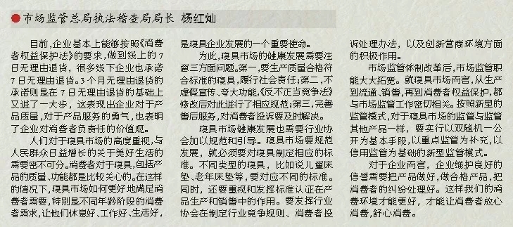 為此,寢具市場的健康發(fā)展需要注意三方面問題。第一,要生產(chǎn)質(zhì)量合格符合標(biāo)準(zhǔn)的寢具,履行社會責(zé)任;第二,不虛假宣傳、夸大功能,《反不正當(dāng)競爭法》修改后對此進(jìn)行了相應(yīng)規(guī)范;第三,完善售后服務(wù),對消費(fèi)者投訴要及時(shí)解決。
