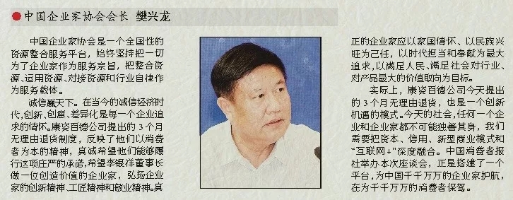 實(shí)際上,康姿百德公司今天提出的3個(gè)月無理由退貨,也是一個(gè)創(chuàng)新機(jī)遇的模式。今天的社會,任何一個(gè)企業(yè)和企業(yè)家都不可能獨(dú)善其身,我們需要把資本、信用、新型商業(yè)模式和“互聯(lián)網(wǎng)+”深度融合。中國消費(fèi)者報(bào)社舉辦本次座談會,正是搭建了一個(gè)平臺,為中國千千萬萬的企業(yè)家護(hù)航,在為千千萬萬的消費(fèi)者保駕。