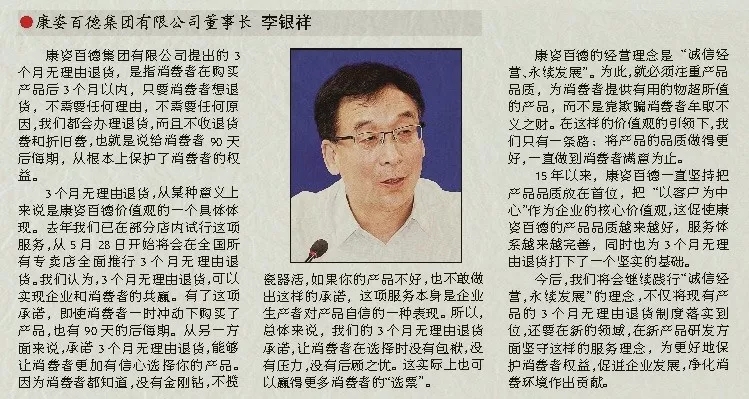誠信贏天下。在當(dāng)今的誠信經(jīng)濟(jì)時(shí)代,創(chuàng)新、創(chuàng)意、差異化是每一個(gè)企業(yè)追求的情懷。康姿百德公司提出的3個(gè)月無理由退貨制度,反映了他們以消費(fèi)者為本的精神,真誠希望他們能夠履行這項(xiàng)莊嚴(yán)的承諾,希望李銀祥董事長做一位創(chuàng)造價(jià)值的企業(yè)家,弘揚(yáng)企業(yè)家的創(chuàng)新精神、工匠精神和敬業(yè)精神。真正的企業(yè)家應(yīng)以家國情懷、以民族興旺為己任,以時(shí)代擔(dān)當(dāng)和奉獻(xiàn)為最大追求,以滿足人民、滿足社會對行業(yè)、對產(chǎn)品最大的價(jià)值取向?yàn)槟繕?biāo)。