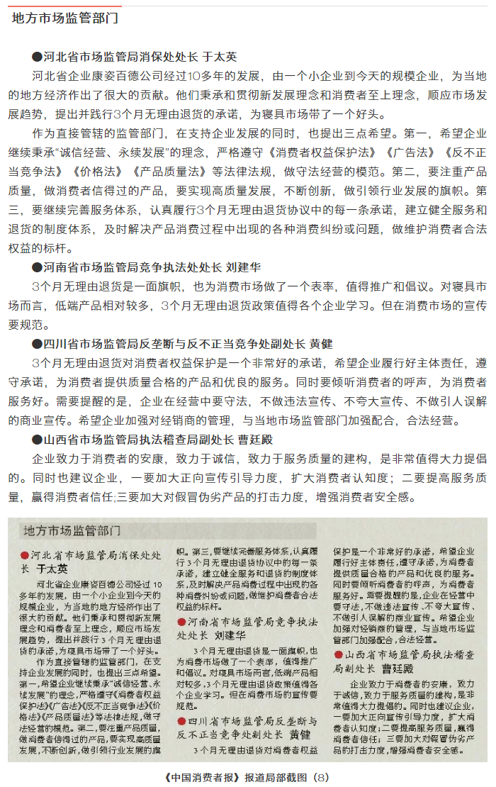 中國消費(fèi)者報(bào)訊 為構(gòu)建良好的消費(fèi)環(huán)境,規(guī)范寢具市場秩序,推動寢具行業(yè)自律和健康發(fā)展,由中國消費(fèi)者報(bào)社主辦、康姿百德集團(tuán)有限公司協(xié)辦的“寢具市場秩序與消費(fèi)者權(quán)益保護(hù)”座談會于2019年5月28日在北京召開,來自國家市場監(jiān)督管理總局相關(guān)司局、中國企業(yè)家協(xié)會的相關(guān)領(lǐng)導(dǎo)、專家及寢具知名企業(yè)代表,圍繞消費(fèi)者權(quán)益保護(hù)、促進(jìn)寢具市場良性競爭與規(guī)范發(fā)展等話題進(jìn)行了深入探討。本次座談會上,與會代表共同見證了康姿百德公司承諾“3個(gè)月無理由退貨”啟動儀式。