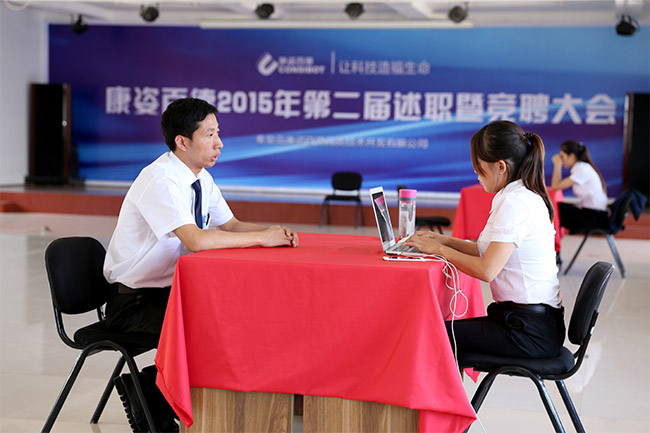 “我參加工作以來一直從事行政管理相關(guān)的工作,對公司日常行政管理工作有更深的理解,這個是我競聘行政主管的優(yōu)勢……”7月2日,在康姿百德科技園辦公樓三樓會議室,參加康姿百德2015年第二屆述職暨競聘大會的行政專員馮璐正在向評審團(tuán)進(jìn)行面試答辯。這也是此次競聘大會最為重要的一個環(huán)節(jié)。