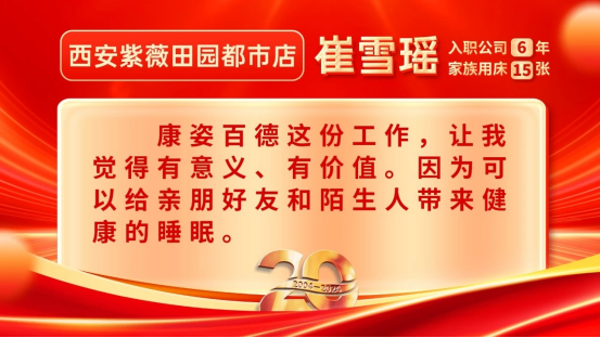 今年是康姿百德集團成立20周年。在20年的發(fā)展歷程中,有這樣一群人,他們在市場經營管理過程中,深刻貫徹以客戶為中心的理念,始終把優(yōu)質的服務融于門店經營的每個環(huán)節(jié),也因此得到了客戶的贊賞和認可。他們就是康姿百德專賣店的員工。本期和您分享的是康姿百德北京地區(qū)和陜西地區(qū)專賣店員工代表的故事。
