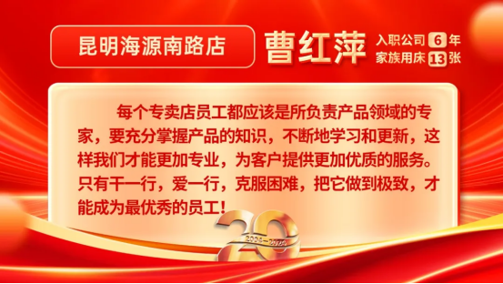 今年是康姿百德集團(tuán)成立20周年。在20年的發(fā)展歷程中,有這樣一群人,他們在市場經(jīng)營管理過程中,深刻貫徹以客戶為中心的理念,始終把優(yōu)質(zhì)的服務(wù)融于門店經(jīng)營的每個(gè)環(huán)節(jié),也因此得到了客戶的贊賞和認(rèn)可。他們就是康姿百德專賣店的員工。本期和您分享的是康姿百德云南地區(qū)和廣東地區(qū)專賣店員工代表的故事。