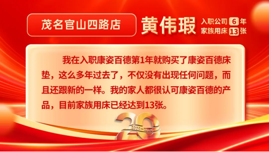 黃偉瑕說道:“我在入職康姿百德第1年就購買了康姿百德床墊,這么多年過去了,不僅沒有出現(xiàn)任何問題,而且還跟新的一樣。我的家人都很認(rèn)可康姿百德的產(chǎn)品,目前家族用床已經(jīng)達(dá)到13張。我目前最大的愿望就是要讓更多消費(fèi)者知道康姿百德這個(gè)品牌,認(rèn)可康姿百德,讓康姿百德成為廣東茂名地區(qū)有影響力的寢具品牌。”