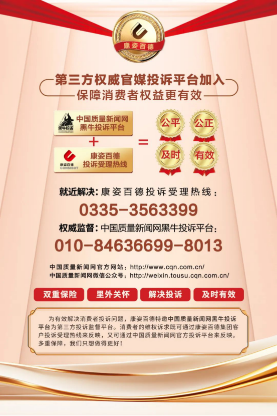多年來,康姿百德認(rèn)真踐行“以客戶為中心”的企業(yè)核心價(jià)值觀,高度重視消費(fèi)者的需求和體驗(yàn)??底税俚录瘓F(tuán)已于2024年3月加入了全國消協(xié)“智慧315”消費(fèi)維權(quán)投訴平臺(tái)。除此之外,康姿百德還特邀中國質(zhì)量新聞網(wǎng)黑牛投訴平臺(tái)作為企業(yè)第三方投訴監(jiān)督平臺(tái),并統(tǒng)一制作監(jiān)督舉報(bào)公示牌懸掛在全國所有門店內(nèi),主動(dòng)接受消費(fèi)者的監(jiān)督。