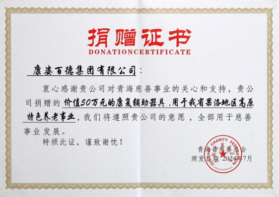 青海省慈善總會(huì)為康姿百德頒發(fā)“捐贈(zèng)證書”