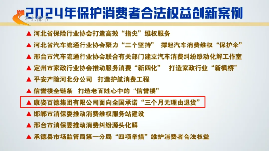 節(jié)目中,河北省消費(fèi)者權(quán)益保護(hù)委員會(huì)秘書長王守用現(xiàn)場宣布了2024年保護(hù)消費(fèi)者合法權(quán)益創(chuàng)新案例??底税俚录瘓F(tuán)有限公司面向全國承諾“三個(gè)月無理由退貨”,成功入選。