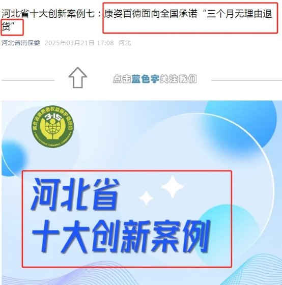 河北省消費者權(quán)益保護委員會還在其官方微信公眾號上,對康姿百德入選“河北省十大創(chuàng)新案例”進行了專題推送,將“三個月無理由退貨”作為典范向社會公開推廣。(原文鏈接請點擊:河北省十大創(chuàng)新案例七:康姿百德面向全國承諾“三個月無理由退貨”)