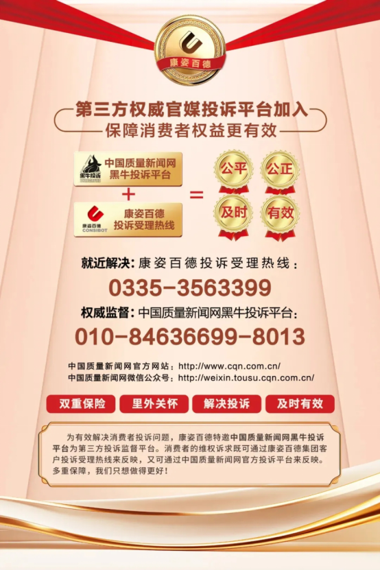 為了進一步提升專賣店的服務(wù)水平,更好地保護消費者的合法權(quán)益,康姿百德開通企業(yè)投訴受理熱線,加入了中國消費者協(xié)會“智慧315”消費維權(quán)投訴平臺,還特邀“中國質(zhì)量新聞網(wǎng)黑牛投訴平臺”作為第三方投訴監(jiān)督平臺。并且,統(tǒng)一制作監(jiān)督舉報公示牌張貼在全國所有門店,主動接受消費者的監(jiān)督。多重途徑保障消費者的合法權(quán)益,真正做到投訴有渠道,事事有回音,件件有著落,讓廣大消費者購買無憂。