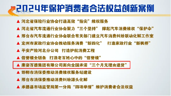 康姿百德面向全國(guó)承諾“三個(gè)月無(wú)理由退貨”還成功入選2024年保護(hù)消費(fèi)者合法權(quán)益十大創(chuàng)新案例,并被河北省消費(fèi)者保護(hù)委員會(huì)作為典范,向全社會(huì)推廣。